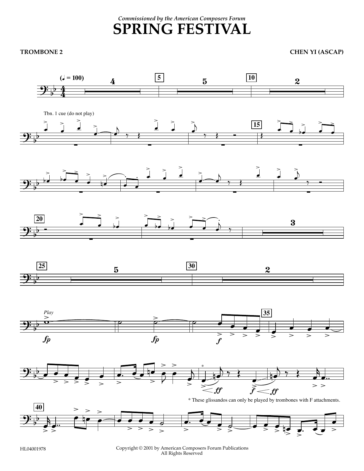 Download or print Chen Yi Spring Festival - Trombone 2 sheet music, chords and digital score arranged for Concert Band. This Concert score includes 2 page(s).