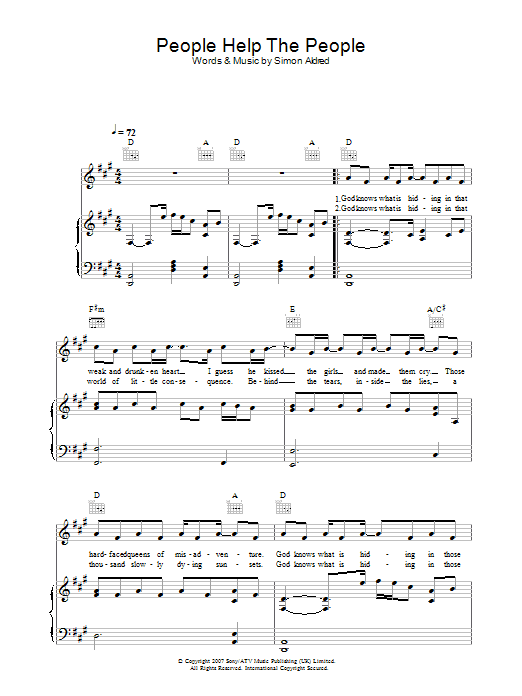 Download or print Cherry Ghost People Help The People sheet music, chords and digital score arranged for Guitar Chords/Lyrics. This Pop score includes 2 page(s).