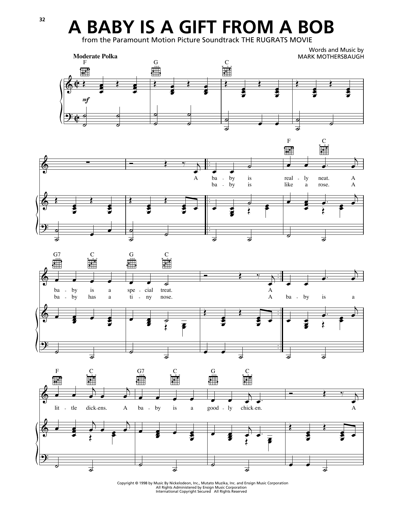 Download or print Cheryl Chase & Cree Summer A Baby Is A Gift From A Bob sheet music, chords and digital score arranged for Piano, Vocal & Guitar Chords (Right-Hand Melody). This Children score includes 4 page(s).