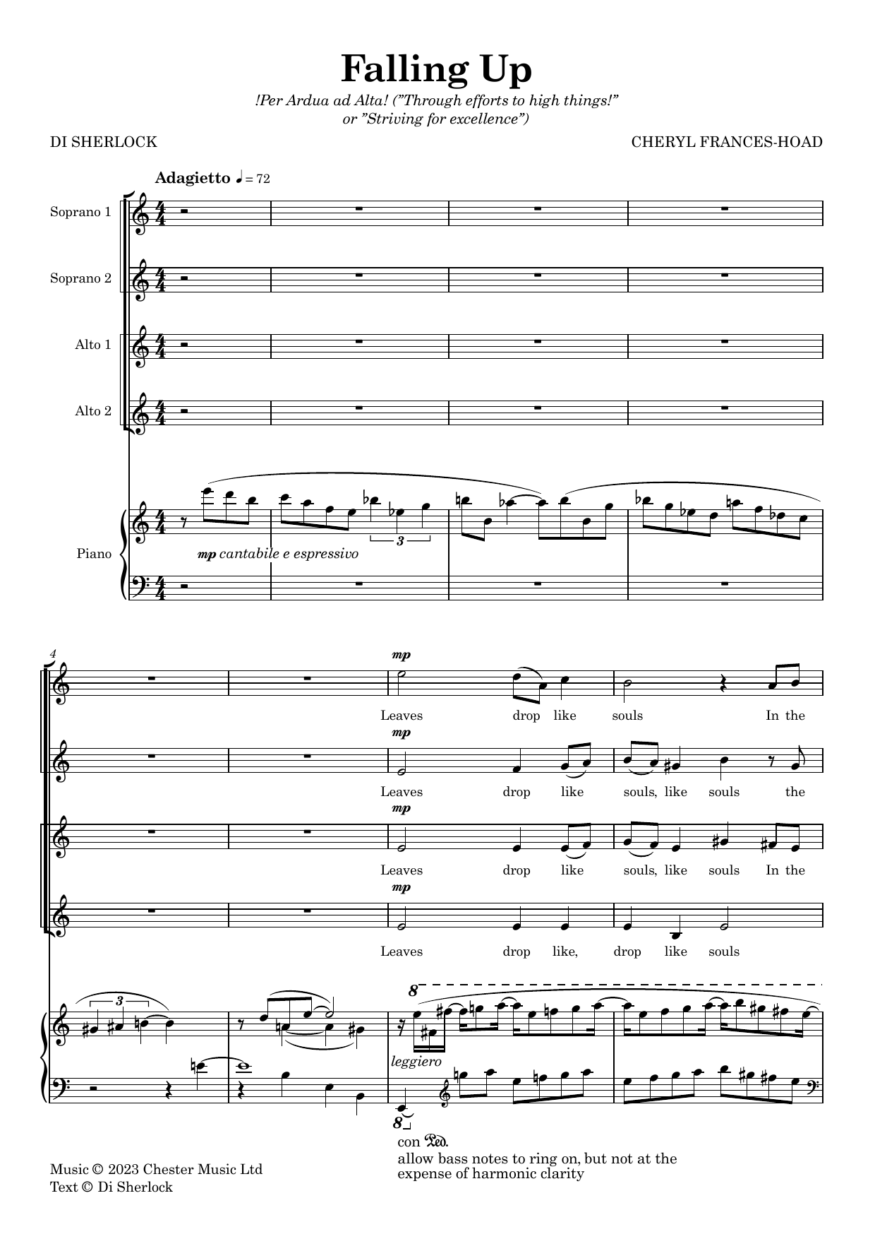 Download or print Cheryl Frances-Hoad Falling Up sheet music, chords and digital score arranged for SSAA Choir. This Classical score includes 9 page(s).