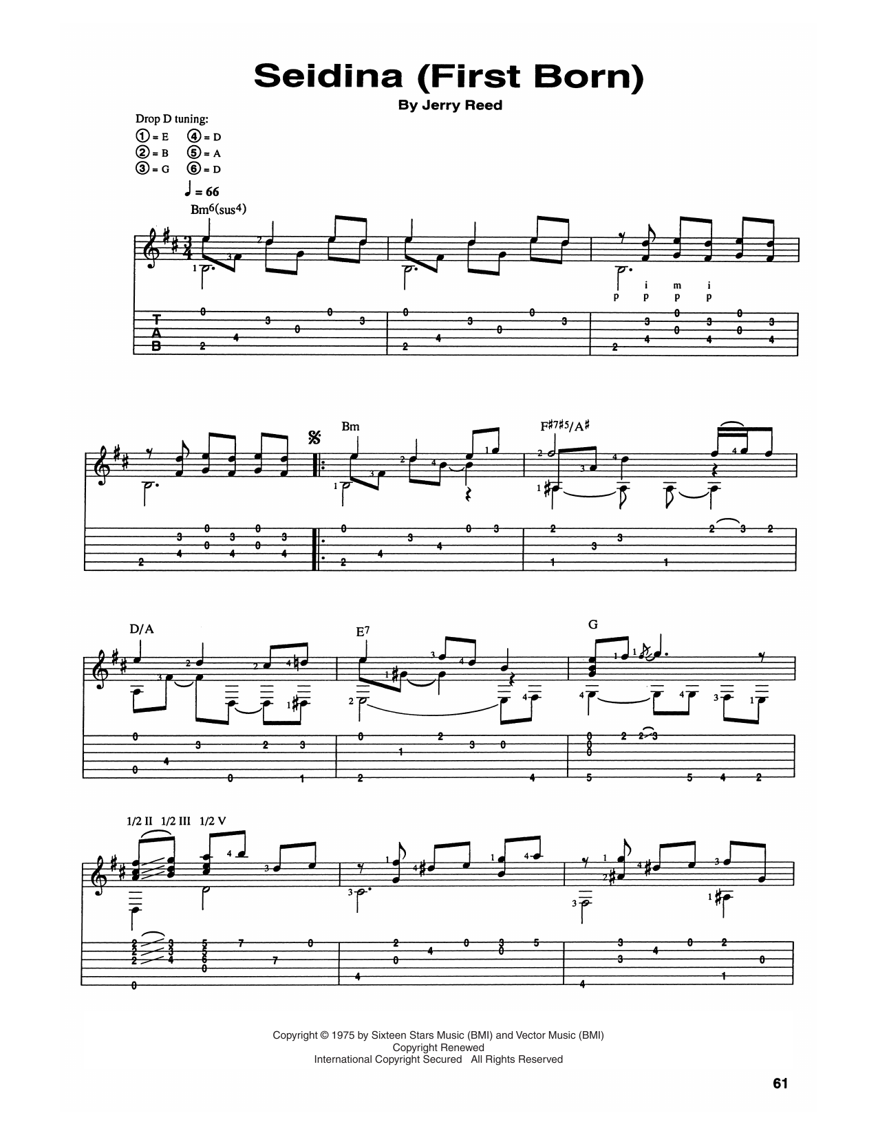 Download or print Chet Atkins and Jerry Reed Seidina (First Born) sheet music, chords and digital score arranged for Guitar Tab. This Country score includes 4 page(s).