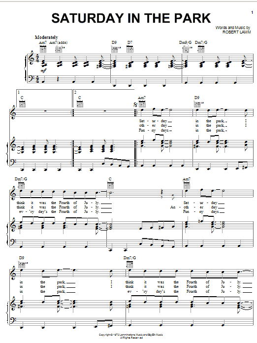 Download or print Chicago Saturday In The Park sheet music, chords and digital score arranged for Piano, Vocal & Guitar Chords (Right-Hand Melody). This Pop score includes 5 page(s).