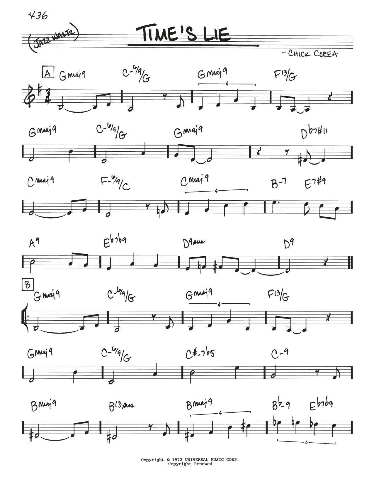 Download or print Chick Corea Time's Lie sheet music, chords and digital score arranged for Real Book – Melody & Chords. This Jazz score includes 2 page(s).