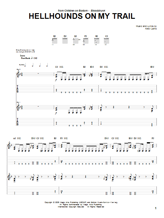 Download or print Children Of Bodom Hellhounds On My Trail sheet music, chords and digital score arranged for Guitar Tab. This Metal score includes 12 page(s).