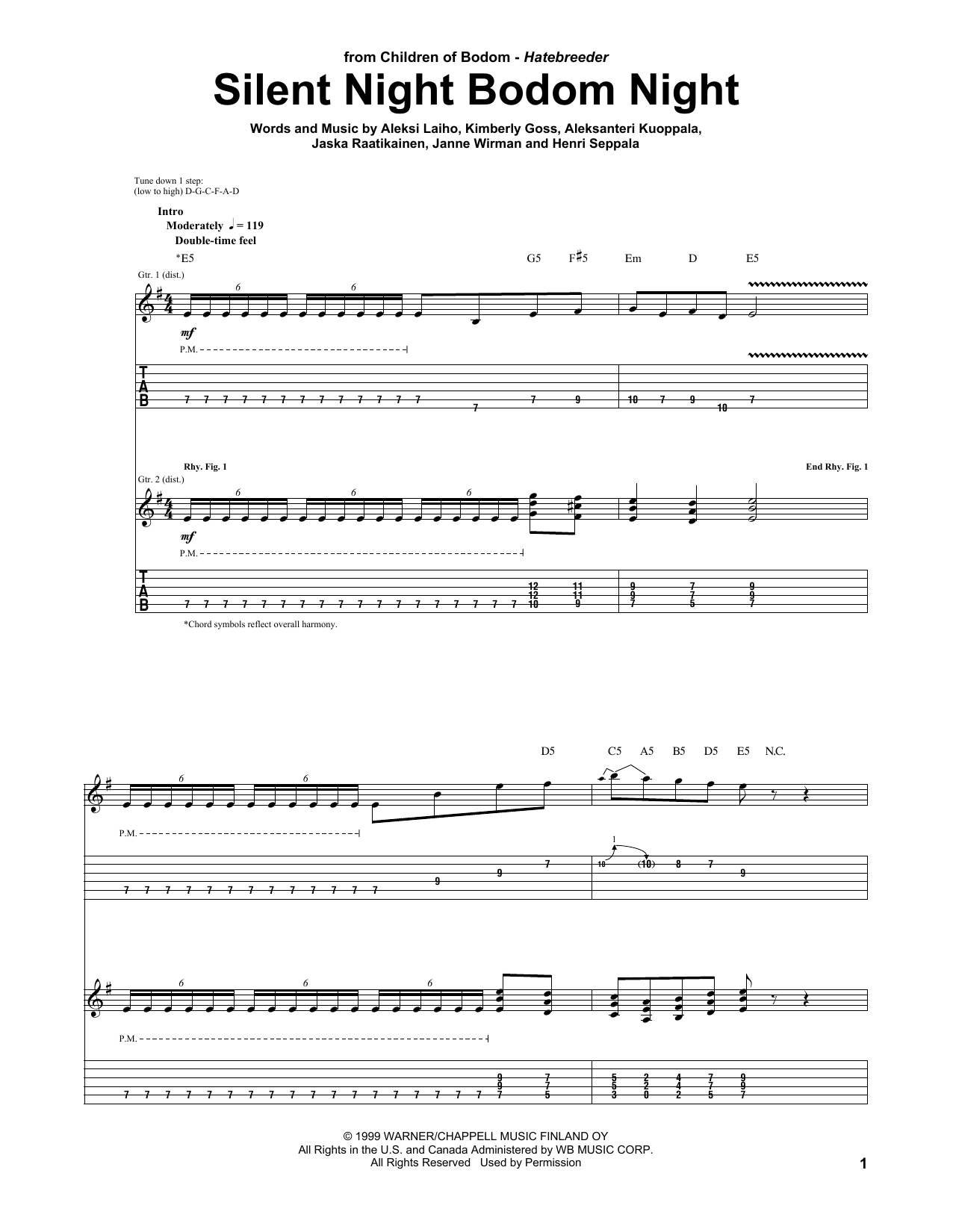 Download or print Children Of Bodom Silent Night Bodom Night sheet music, chords and digital score arranged for Guitar Tab. This Metal score includes 16 page(s).