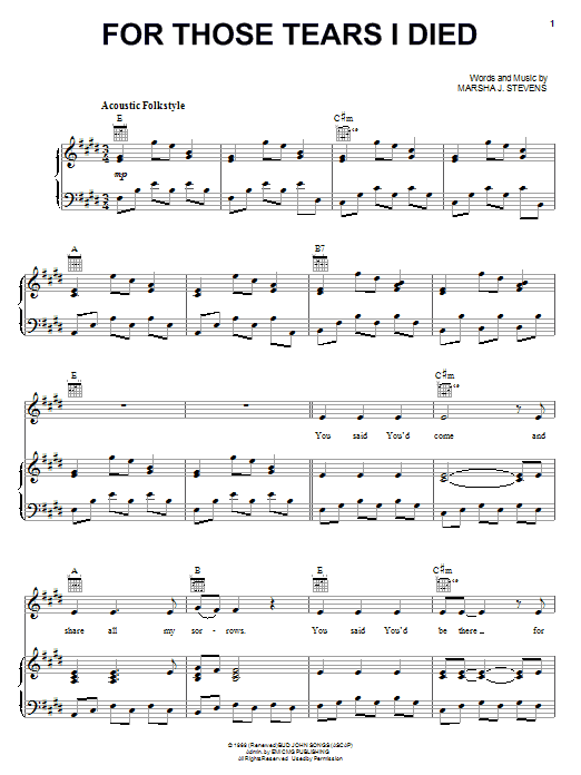 Download or print Children Of The Day For Those Tears I Died sheet music, chords and digital score arranged for Piano, Vocal & Guitar Chords (Right-Hand Melody). This Christian score includes 8 page(s).