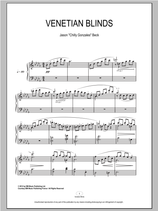 Download or print Chilly Gonzales Venetian Blinds sheet music, chords and digital score arranged for Piano Solo. This Classical score includes 5 page(s).