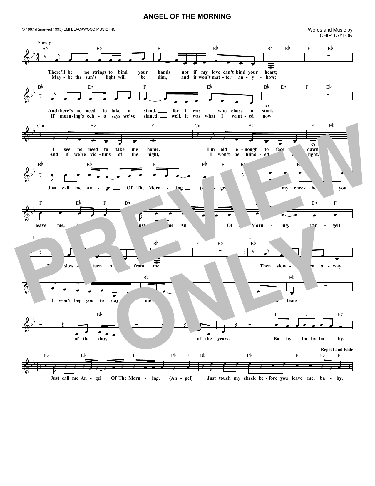Download or print Chip Taylor Angel Of The Morning sheet music, chords and digital score arranged for Lead Sheet / Fake Book. This Love score includes 1 page(s).