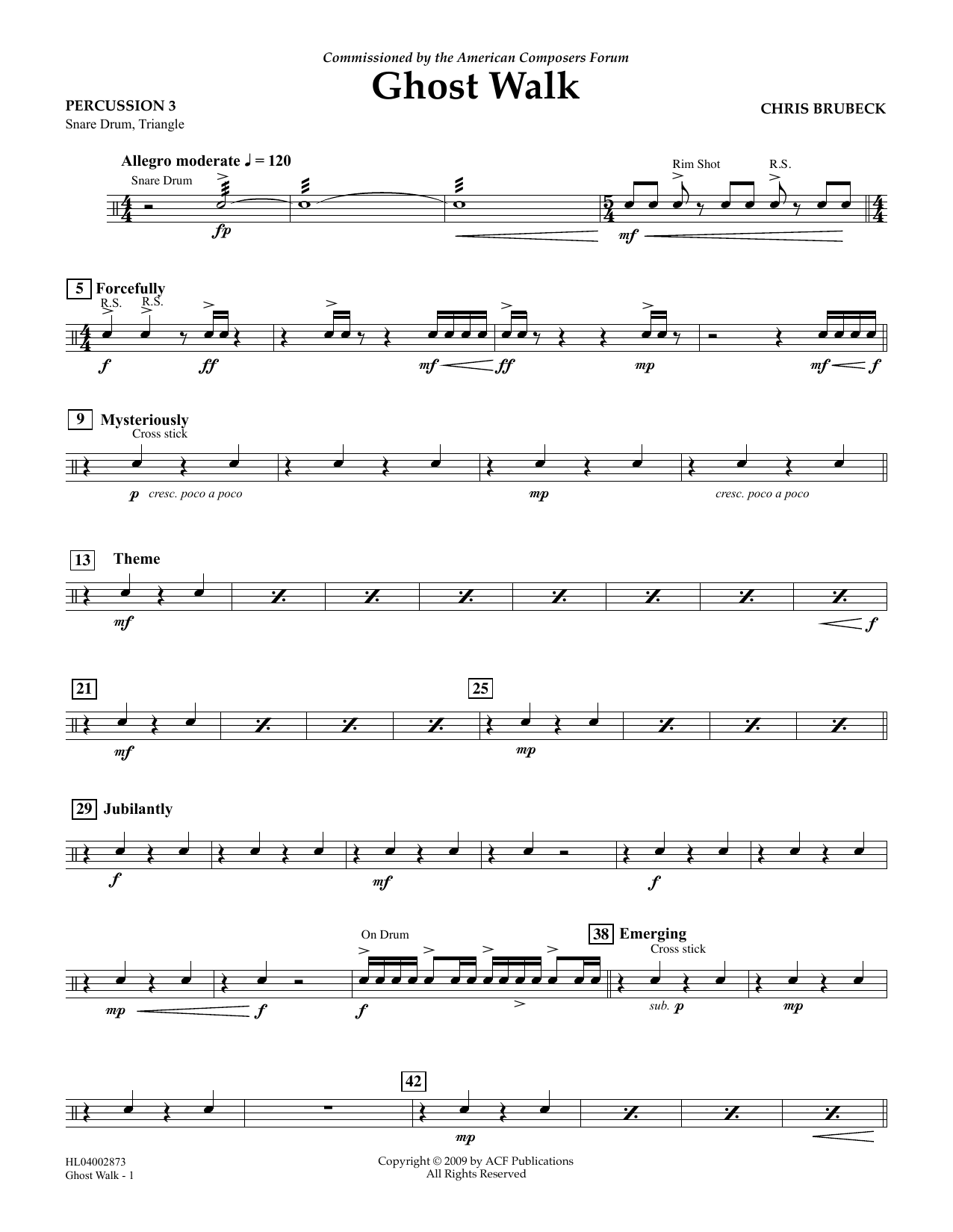 Download or print Chris Brubeck Ghost Walk - Percussion 3 sheet music, chords and digital score arranged for Concert Band. This Concert score includes 2 page(s).
