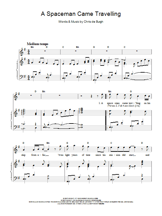 Download or print Chris de Burgh A Spaceman Came Travelling sheet music, chords and digital score arranged for Flute Solo. This Christmas score includes 3 page(s).