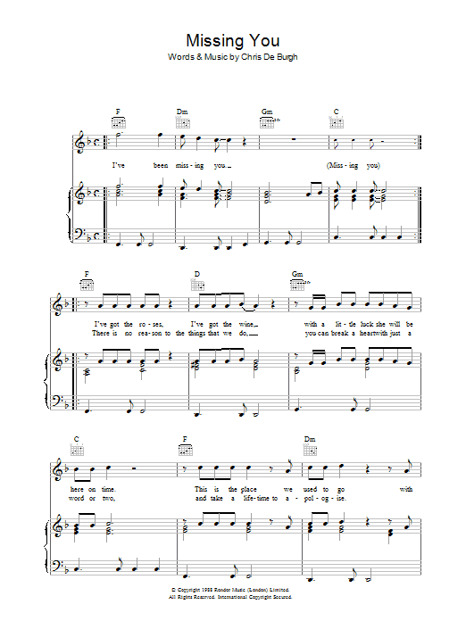 Download or print Chris de Burgh Missing You sheet music, chords and digital score arranged for Piano, Vocal & Guitar Chords. This Pop score includes 5 page(s).