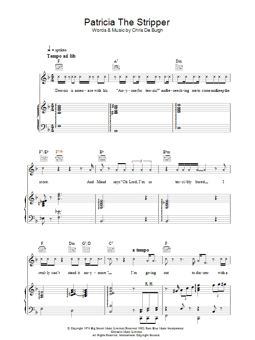 Download or print Chris de Burgh Patricia The Stripper sheet music, chords and digital score arranged for Piano, Vocal & Guitar Chords. This Pop score includes 7 page(s).