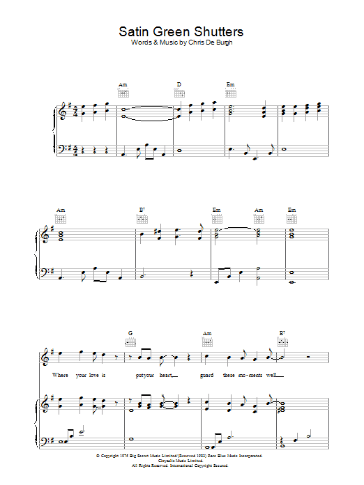 Download or print Chris de Burgh Satin Green Shutters sheet music, chords and digital score arranged for Piano, Vocal & Guitar Chords. This Pop score includes 9 page(s).