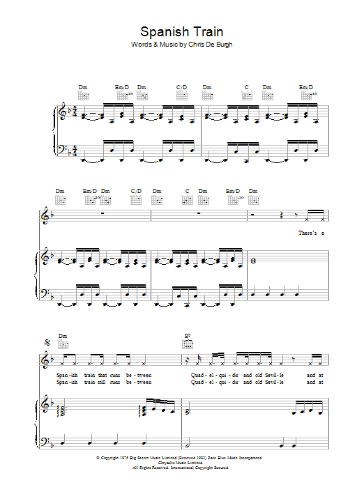 Download or print Chris de Burgh Spanish Train sheet music, chords and digital score arranged for Guitar Chords/Lyrics. This Pop score includes 4 page(s).