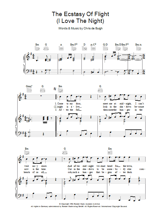 Download or print Chris de Burgh The Ecstasy Of Flight (I Love The Night) sheet music, chords and digital score arranged for Piano, Vocal & Guitar Chords. This Pop score includes 6 page(s).
