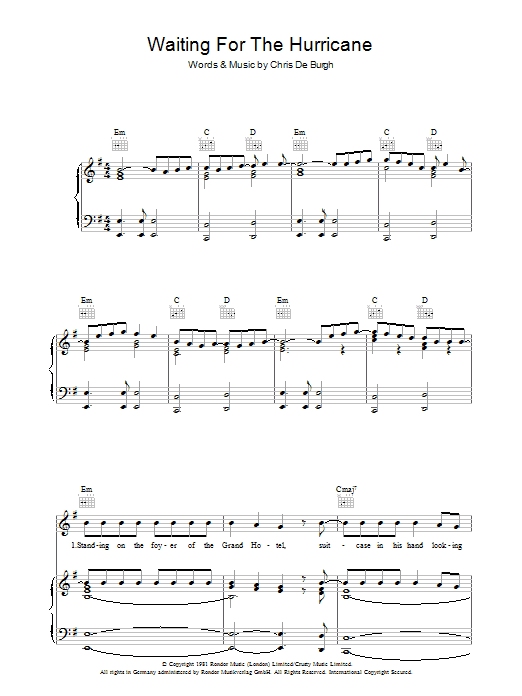Download or print Chris de Burgh Waiting For The Hurricane sheet music, chords and digital score arranged for Piano, Vocal & Guitar Chords. This Pop score includes 6 page(s).