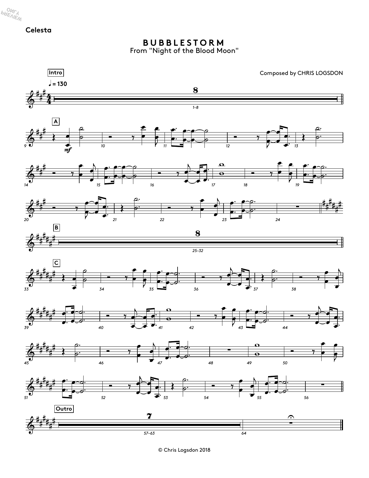Download or print Chris Logsdon Bubblestorm (from Night of the Blood Moon) - Celesta sheet music, chords and digital score arranged for Performance Ensemble. This Video Game score includes 1 page(s).