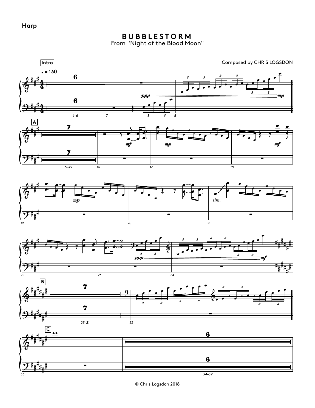 Download or print Chris Logsdon Bubblestorm (from Night of the Blood Moon) - Harp sheet music, chords and digital score arranged for Performance Ensemble. This Video Game score includes 2 page(s).