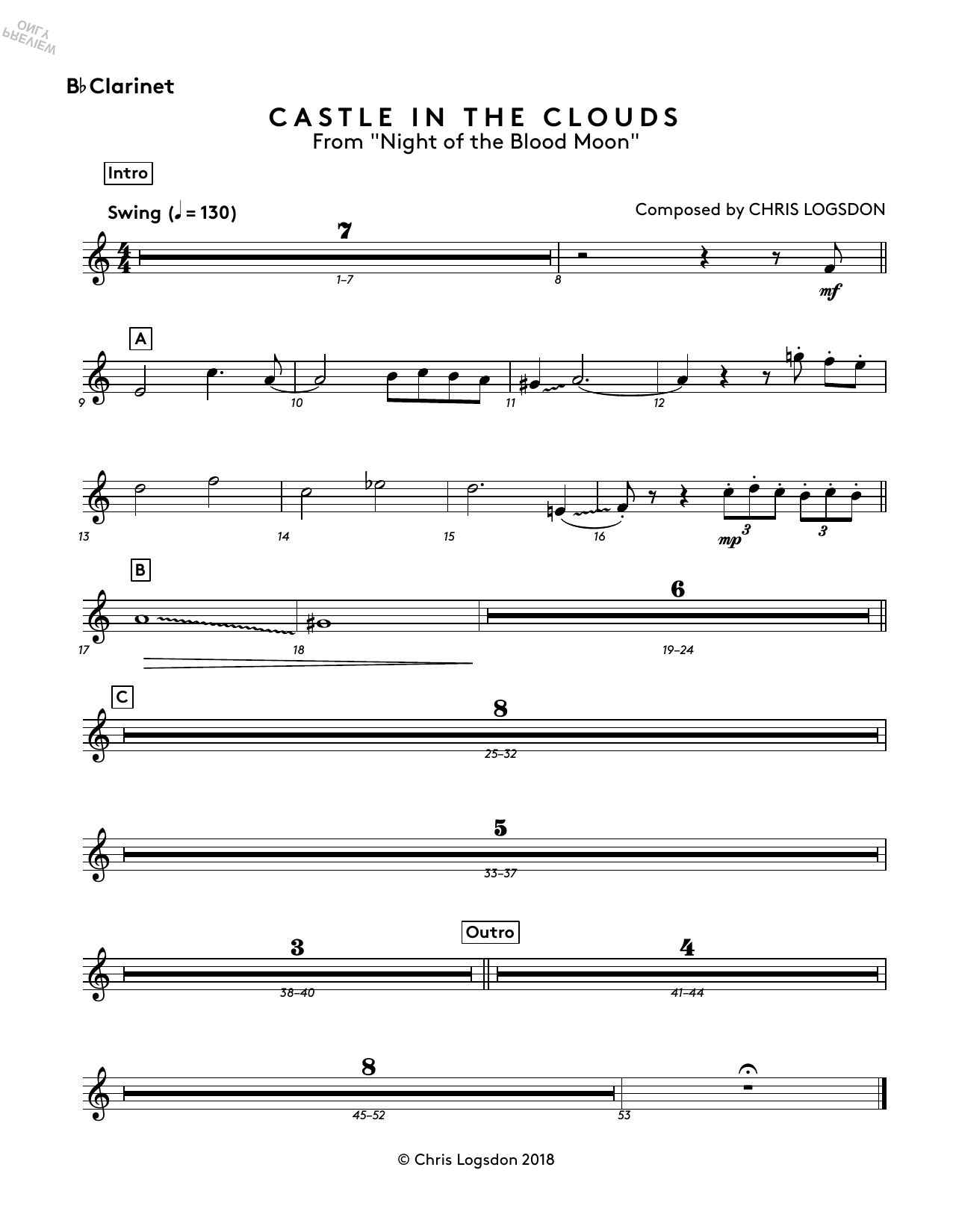 Download or print Chris Logsdon Castle In The Clouds (from Night of the Blood Moon) - Bb Clarinet sheet music, chords and digital score arranged for Performance Ensemble. This Video Game score includes 1 page(s).