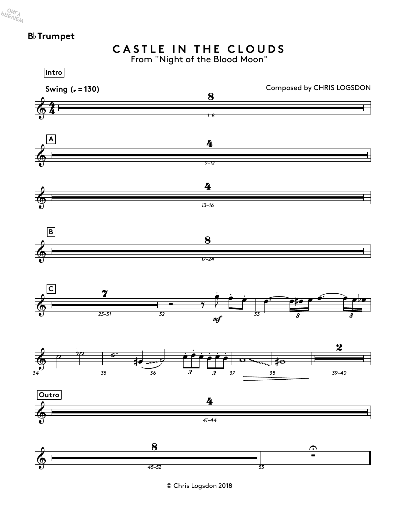 Download or print Chris Logsdon Castle In The Clouds (from Night of the Blood Moon) - Bb Trumpet sheet music, chords and digital score arranged for Performance Ensemble. This Video Game score includes 1 page(s).