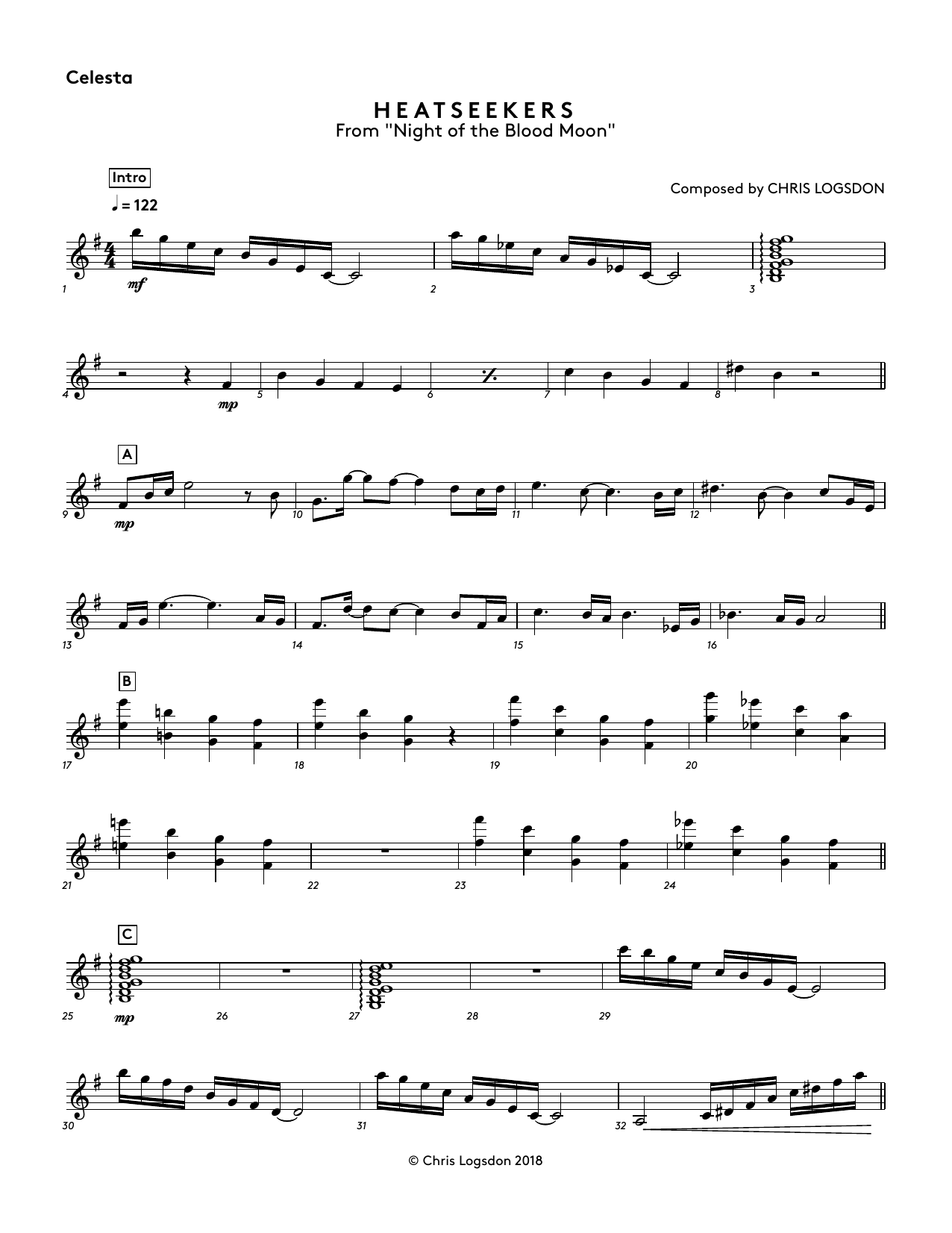 Download or print Chris Logsdon Heatseekers (from Night of the Blood Moon) - Celesta sheet music, chords and digital score arranged for Performance Ensemble. This Video Game score includes 2 page(s).