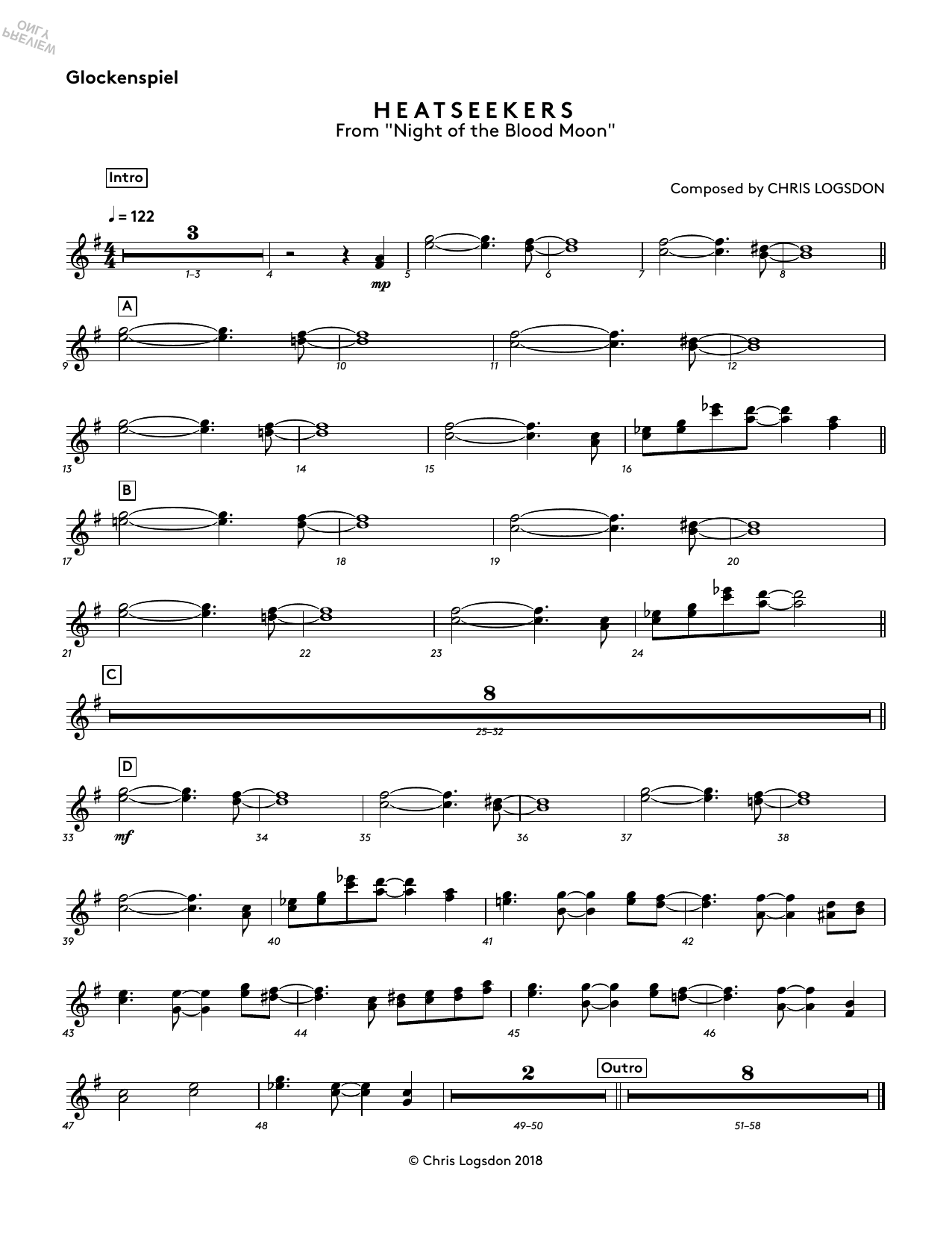Download or print Chris Logsdon Heatseekers (from Night of the Blood Moon) - Glockenspiel sheet music, chords and digital score arranged for Performance Ensemble. This Video Game score includes 1 page(s).