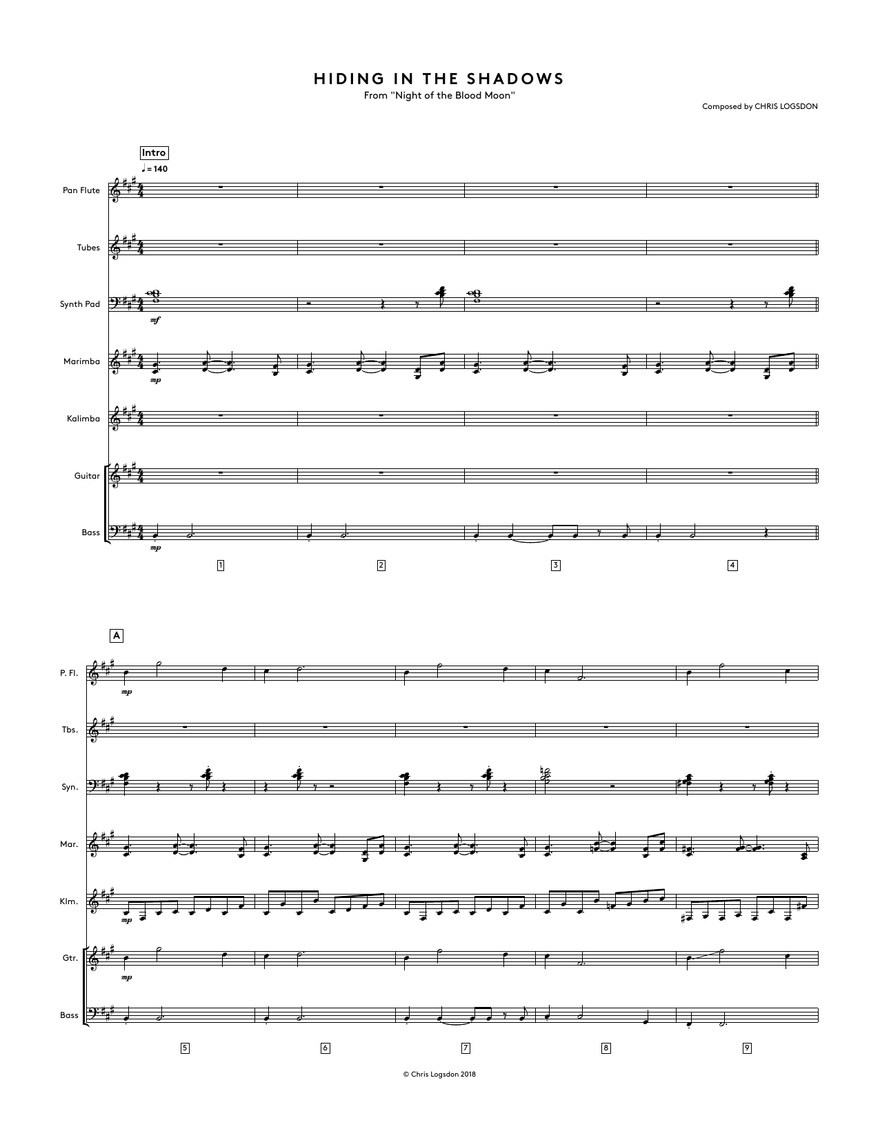 Download or print Chris Logsdon Hiding In The Shadows (from Night of the Blood Moon) - Full Score sheet music, chords and digital score arranged for Performance Ensemble. This Video Game score includes 6 page(s).