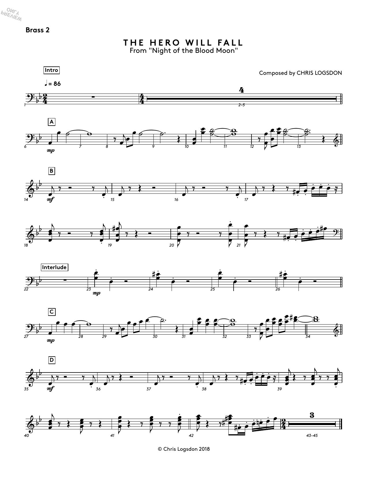 Download or print Chris Logsdon The Hero Will Fall (from Night of the Blood Moon) - Brass 2 sheet music, chords and digital score arranged for Performance Ensemble. This Video Game score includes 1 page(s).