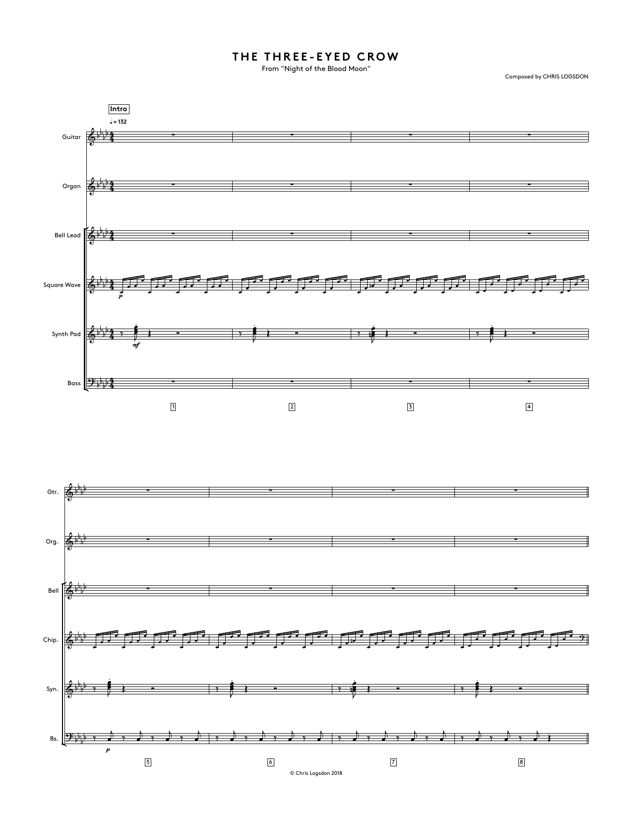 Download or print Chris Logsdon The Three-Eyed Crow (from Night of the Blood Moon) - Full Score sheet music, chords and digital score arranged for Performance Ensemble. This Video Game score includes 8 page(s).