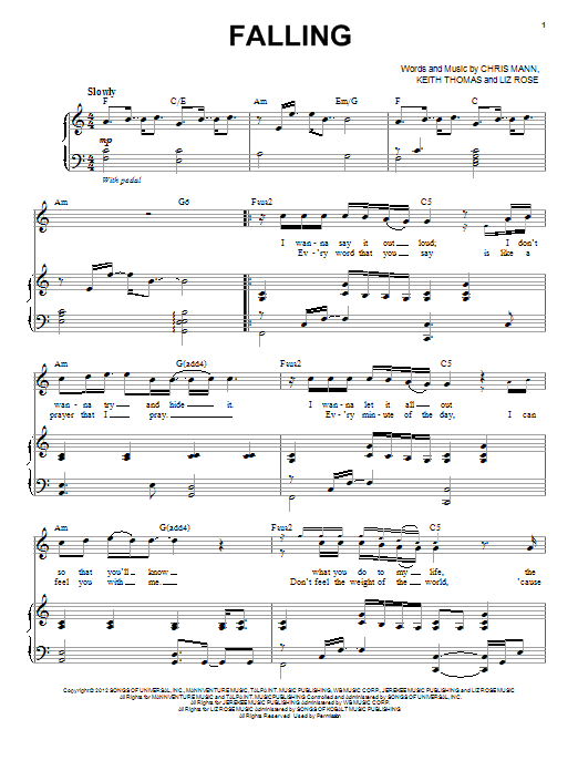 Download or print Chris Mann Falling sheet music, chords and digital score arranged for Piano & Vocal. This Pop score includes 5 page(s).