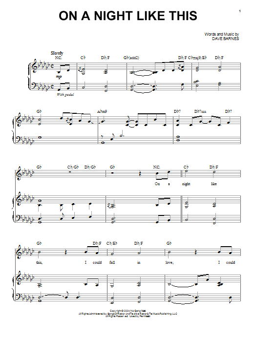 Download or print Chris Mann On A Night Like This sheet music, chords and digital score arranged for Piano & Vocal. This Pop score includes 5 page(s).