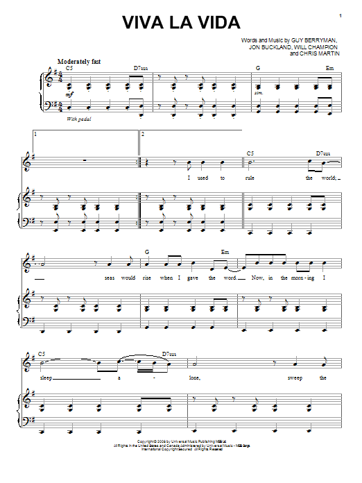 Download or print Chris Mann Viva La Vida sheet music, chords and digital score arranged for Piano & Vocal. This Standards score includes 8 page(s).