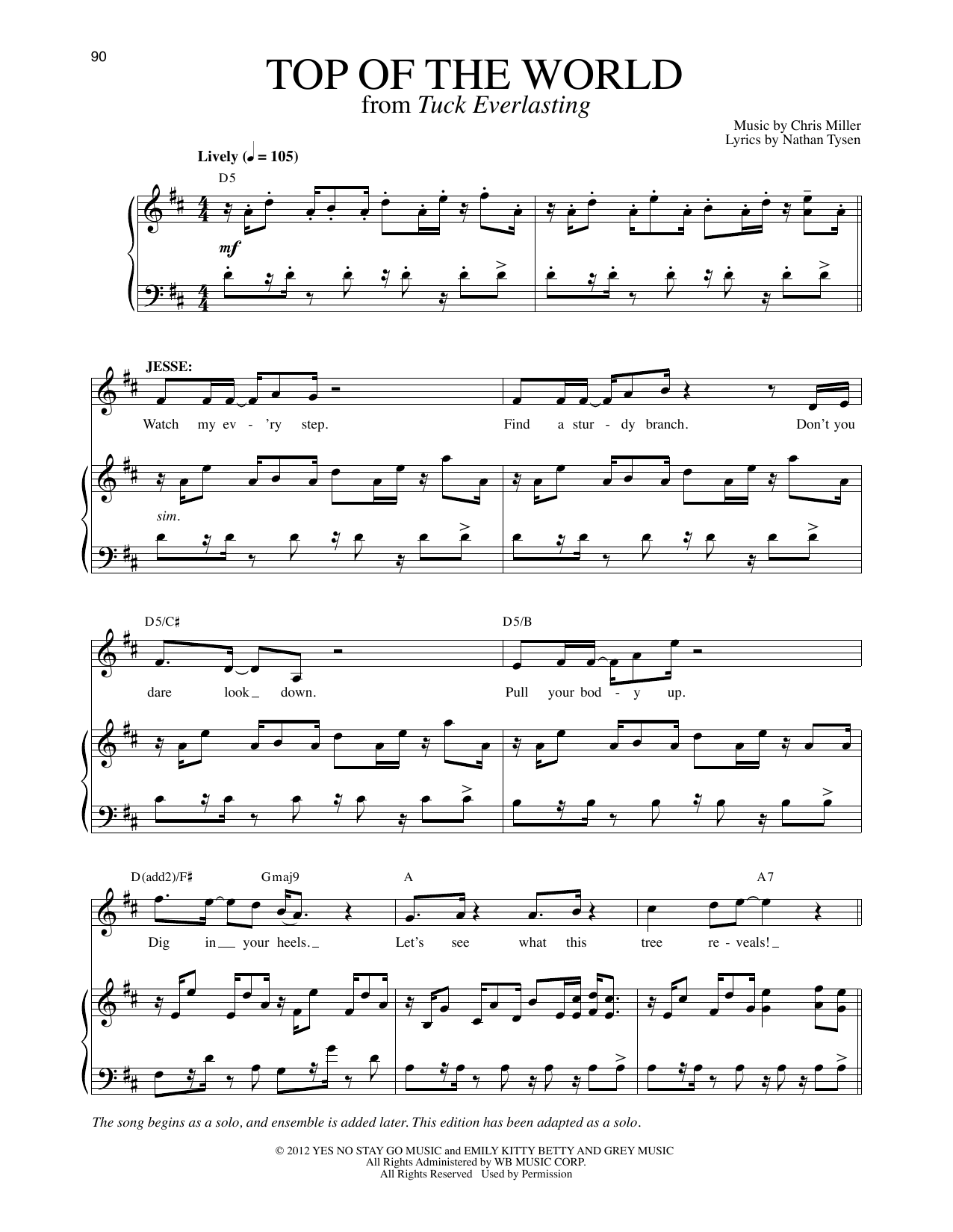 Download or print Chris Miller and Nathan Tysen Top Of The World (Solo Version) (from Tuck Everlasting) sheet music, chords and digital score arranged for Piano & Vocal. This Broadway score includes 7 page(s).