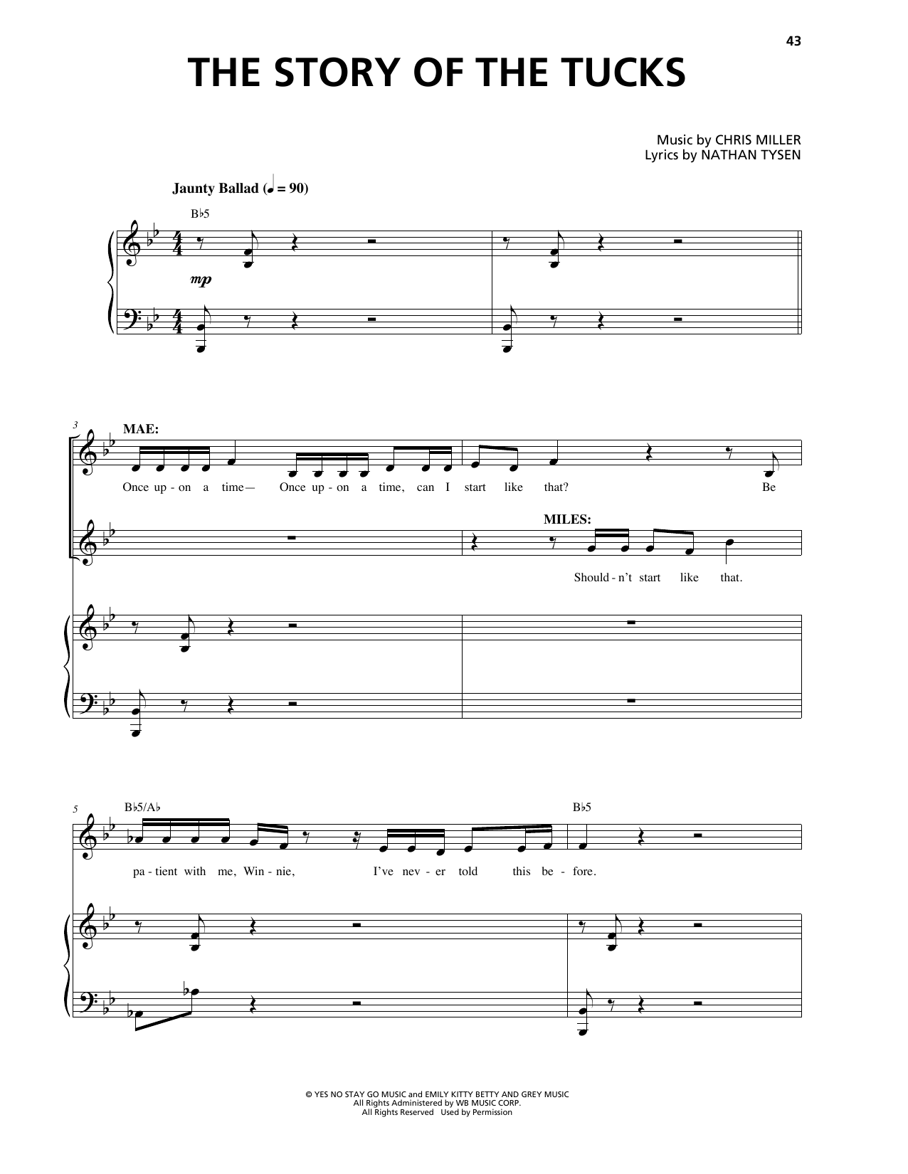 Download or print Chris Miller The Story Of The Tucks sheet music, chords and digital score arranged for Piano & Vocal. This Musical/Show score includes 10 page(s).