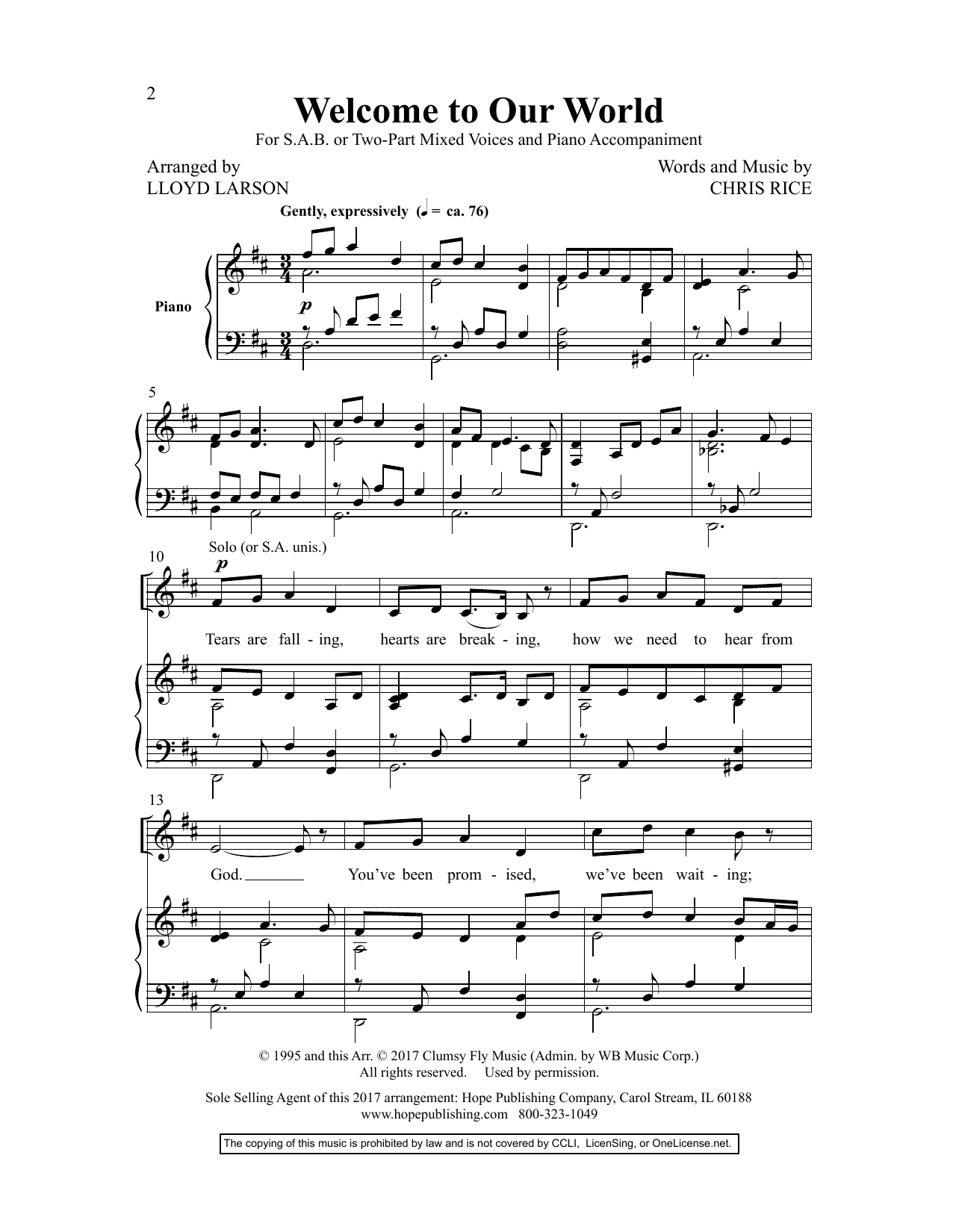 Download or print Chris Rice Welcome to Our World (arr. Lloyd Larson) sheet music, chords and digital score arranged for SAB Choir. This Sacred score includes 7 page(s).
