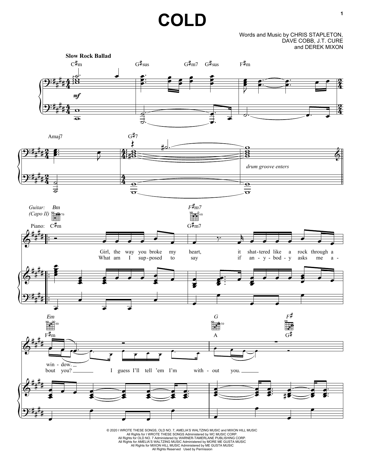 Download or print Chris Stapleton Cold sheet music, chords and digital score arranged for Piano, Vocal & Guitar Chords (Right-Hand Melody). This Country score includes 5 page(s).