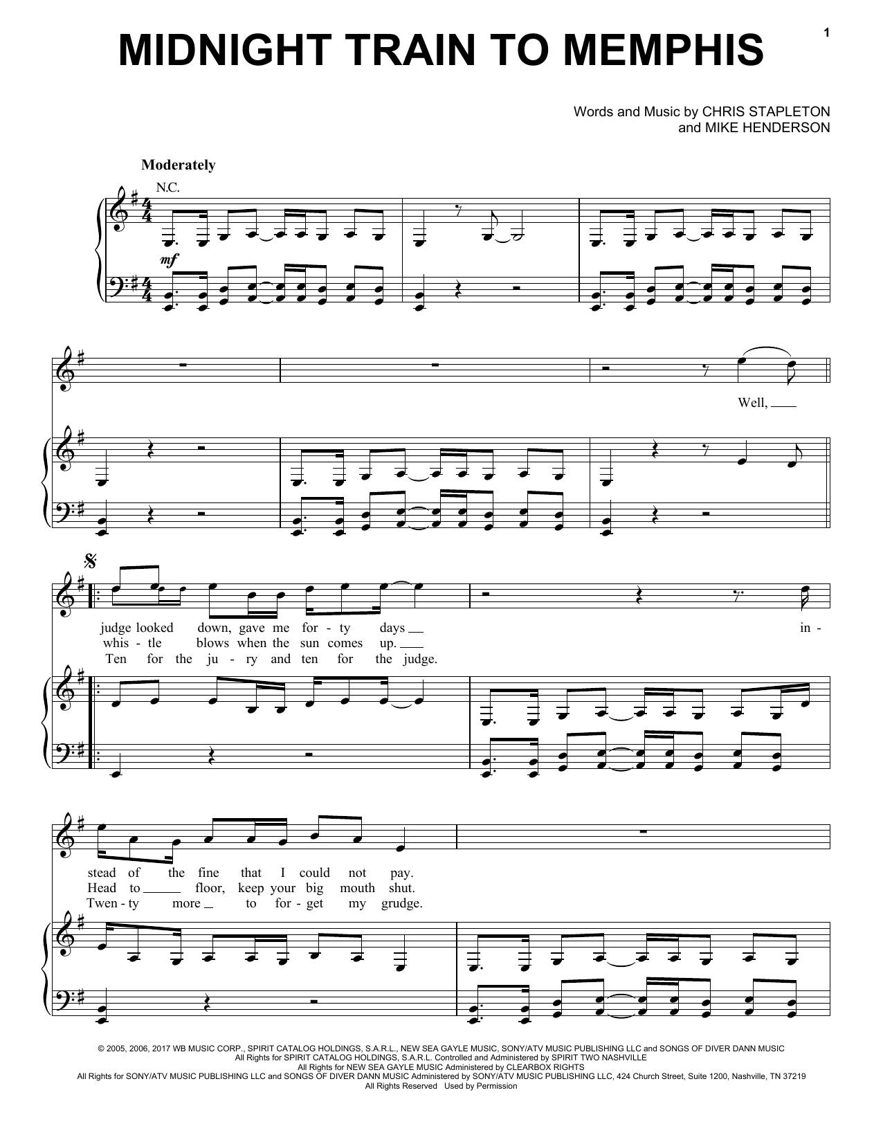 Download or print Chris Stapleton Midnight Train To Memphis sheet music, chords and digital score arranged for Piano, Vocal & Guitar Chords (Right-Hand Melody). This Country score includes 4 page(s).
