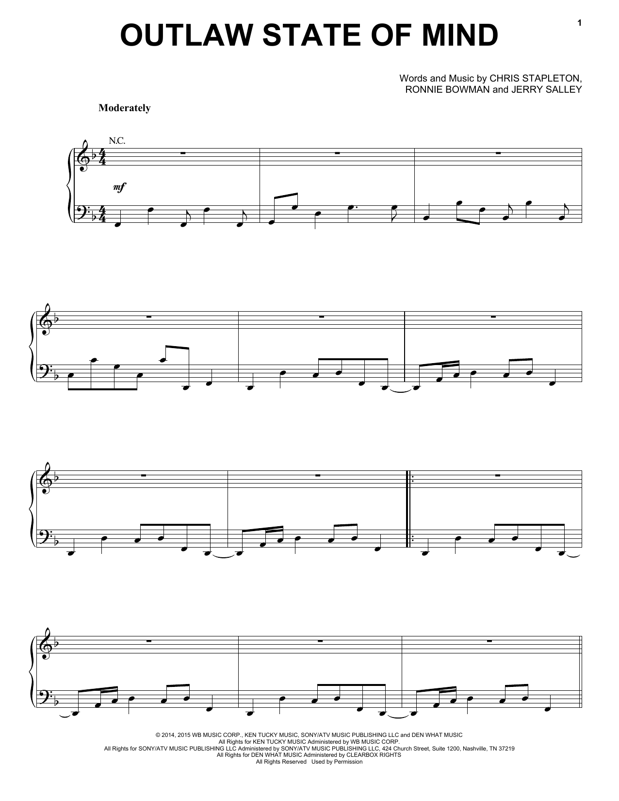 Download or print Chris Stapleton Outlaw State Of Mind sheet music, chords and digital score arranged for Piano, Vocal & Guitar Chords (Right-Hand Melody). This Country score includes 6 page(s).