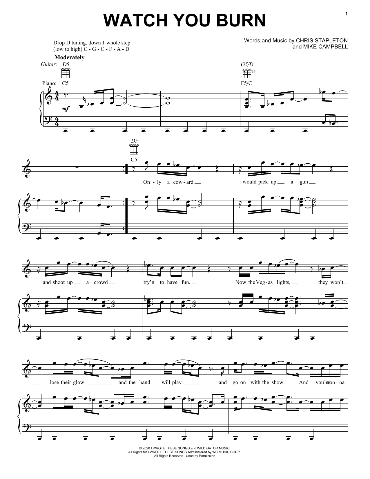 Download or print Chris Stapleton Watch You Burn sheet music, chords and digital score arranged for Piano, Vocal & Guitar Chords (Right-Hand Melody). This Country score includes 5 page(s).