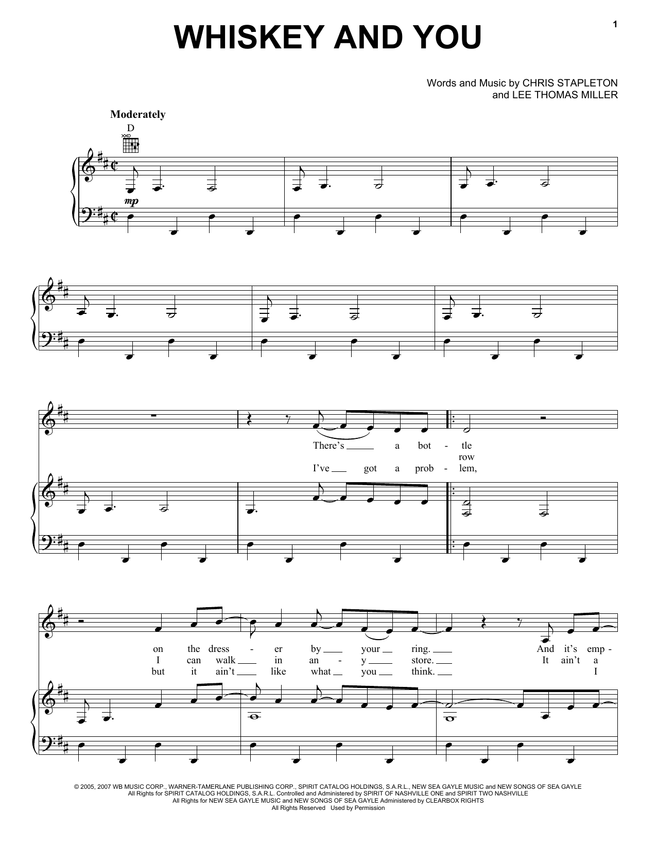 Download or print Chris Stapleton Whiskey And You sheet music, chords and digital score arranged for Piano, Vocal & Guitar Chords (Right-Hand Melody). This Country score includes 5 page(s).