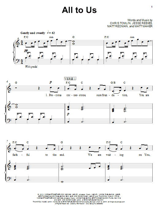 Download or print Chris Tomlin All To Us sheet music, chords and digital score arranged for Piano, Vocal & Guitar Chords (Right-Hand Melody). This Pop score includes 7 page(s).