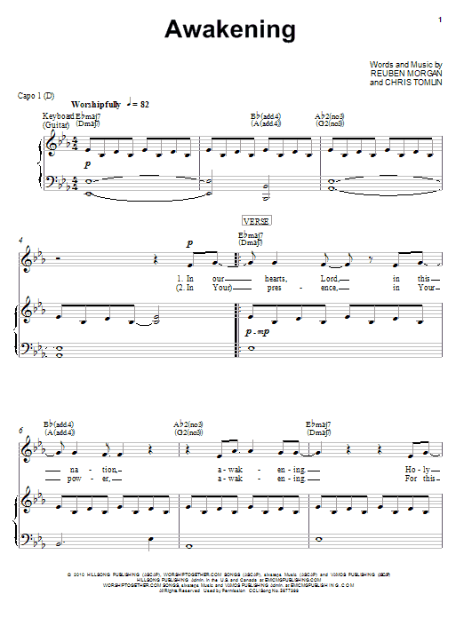 Download or print Chris Tomlin Awakening sheet music, chords and digital score arranged for Easy Piano. This Christian score includes 4 page(s).