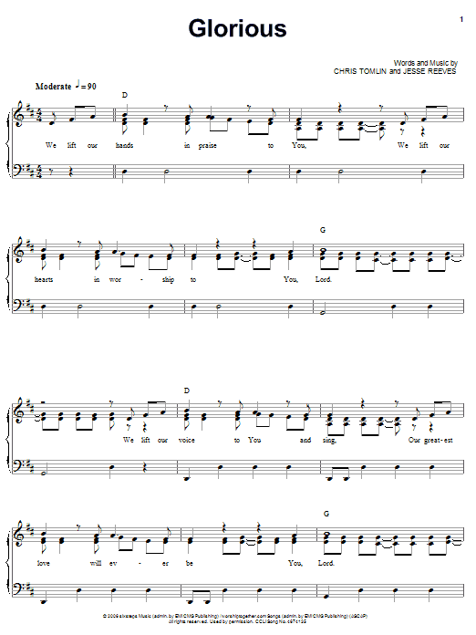 Download or print Chris Tomlin Glorious sheet music, chords and digital score arranged for Easy Piano. This Christian score includes 5 page(s).