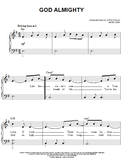 Download or print Chris Tomlin God Almighty sheet music, chords and digital score arranged for Easy Piano. This Christian score includes 6 page(s).