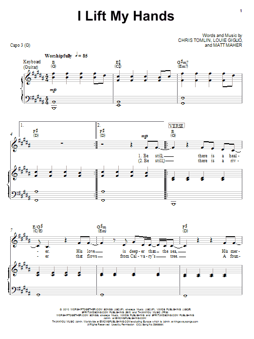 Download or print Chris Tomlin I Lift My Hands sheet music, chords and digital score arranged for Piano, Vocal & Guitar Chords (Right-Hand Melody). This Pop score includes 6 page(s).