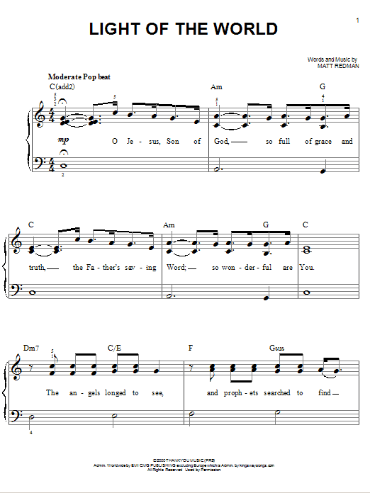 Download or print Chris Tomlin Light Of The World sheet music, chords and digital score arranged for Easy Piano. This Christian score includes 6 page(s).