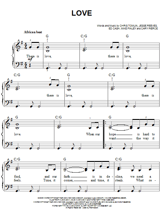 Download or print Chris Tomlin Love sheet music, chords and digital score arranged for Easy Piano. This Christian score includes 5 page(s).