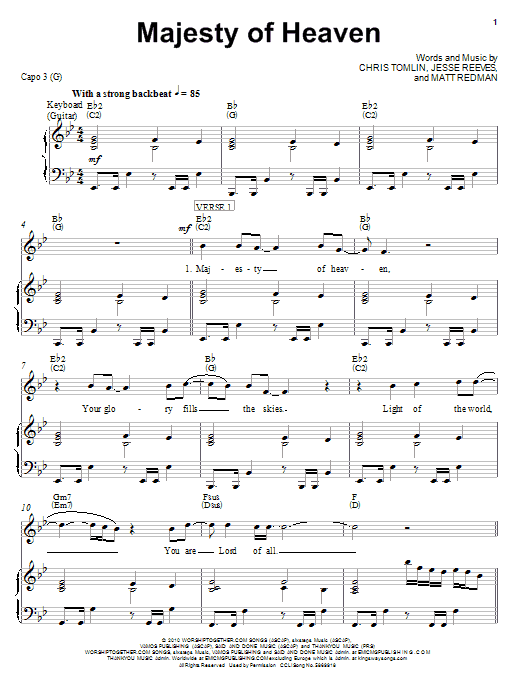 Download or print Chris Tomlin Majesty Of Heaven sheet music, chords and digital score arranged for Easy Piano. This Christian score includes 4 page(s).
