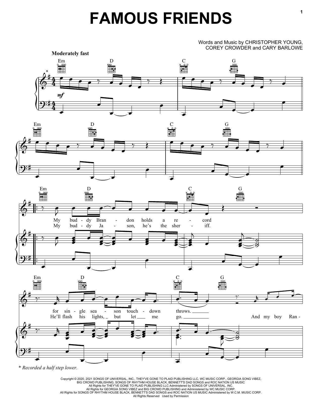 Download or print Chris Young and Kane Brown Famous Friends sheet music, chords and digital score arranged for Piano, Vocal & Guitar Chords (Right-Hand Melody). This Country score includes 5 page(s).