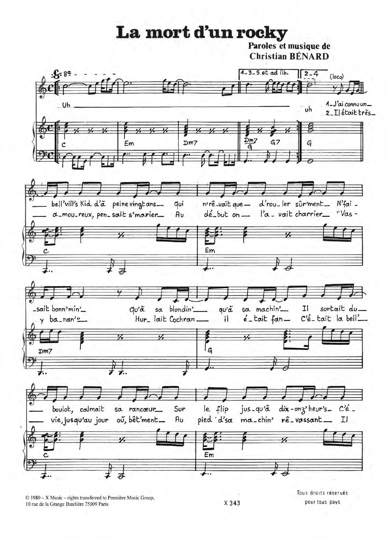 Download or print Christian La Mort D'un Rocky sheet music, chords and digital score arranged for Piano & Vocal. This Pop score includes 3 page(s).